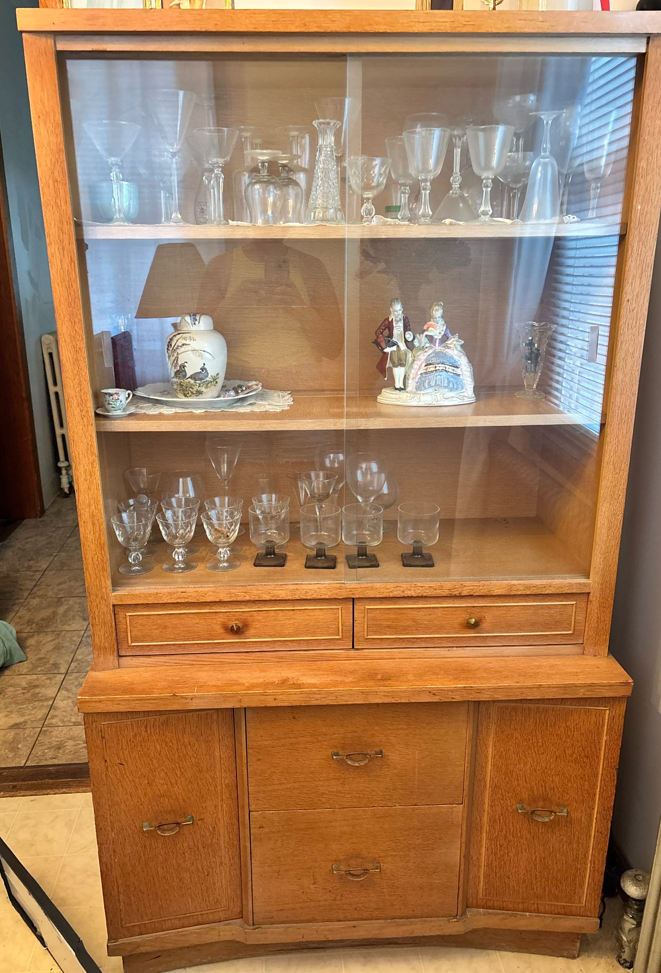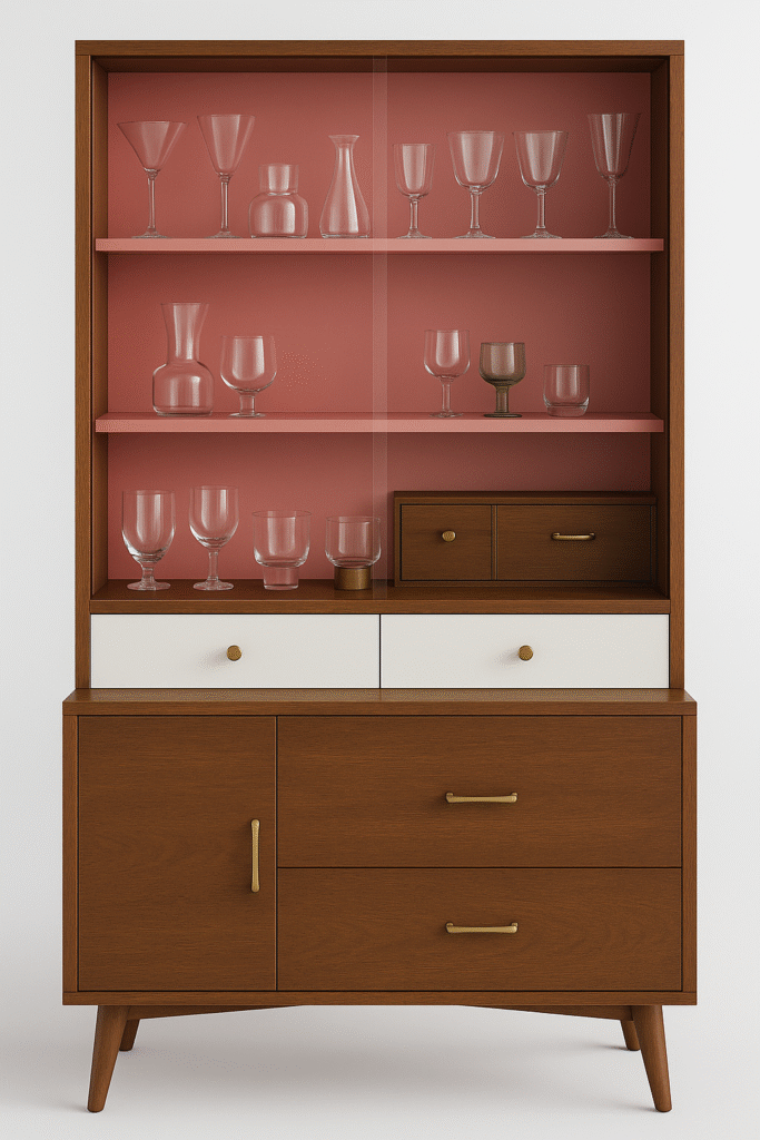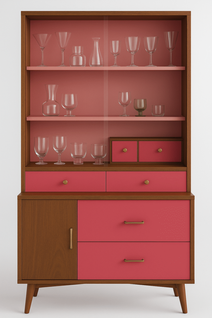I never thought I’d end up with my grandmother’s furniture, let alone her mid-century china cabinet. Over the years, I was always curious about the jungle of glassware and the photos hidden in the drawers. It was a staple piece in her dining room that I imagine she used on special occasions ever since she arrived here from Tuscany. It made perfect sense that when no one else took an interest in the piece, I would give it a new home. I’ve always wanted a place to store my collectables: pink glass, ceramics, antique silverware, and fabrics. I was so thrilled! The little brass knobs and handles were wiped of their tarnish, turning them fabulously vintage.