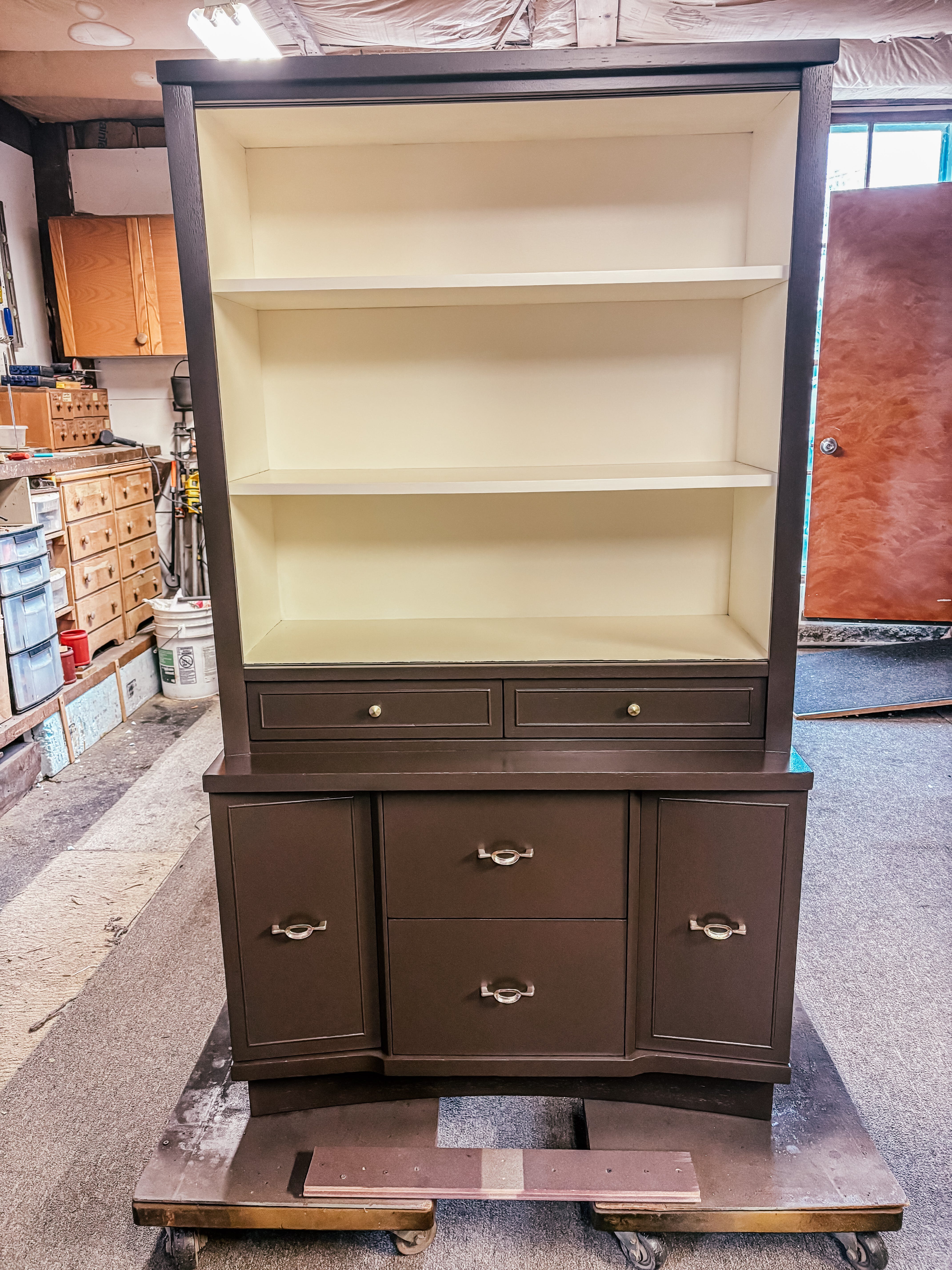 The piece has clean, straight lines and delicate, minimal detail. It has three shelves hidden behind sliding glass doors. Below are two small and two large drawers with two compartments on either side. It has good bones, but it was up for a refurbishment job.