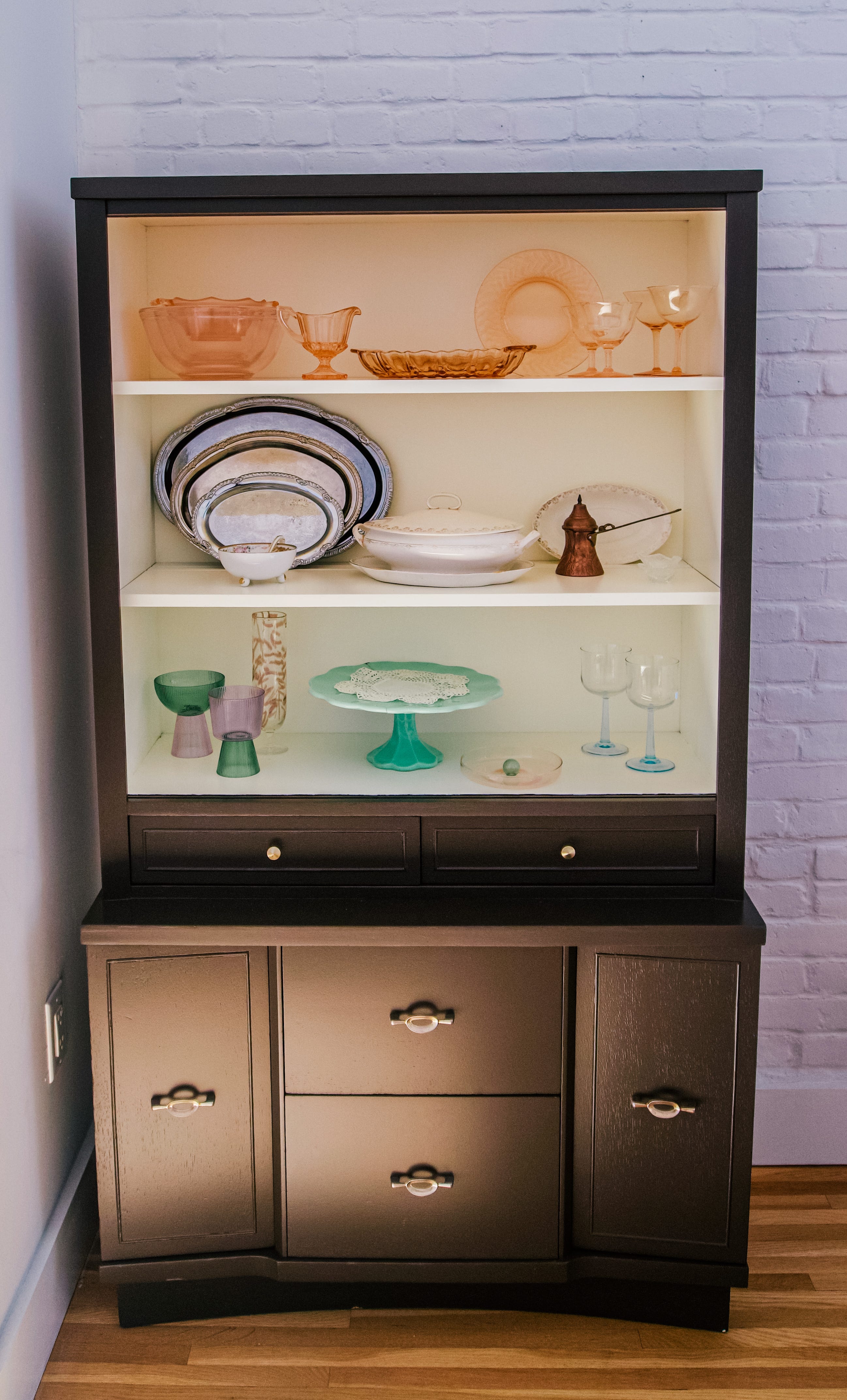 I never thought I’d end up with my grandmother’s furniture, let alone her mid-century china cabinet. Over the years, I was always curious about the jungle of glassware and the photos hidden in the drawers. It was a staple piece in her dining room that I imagine she used on special occasions ever since she arrived here from Tuscany. It made perfect sense that when no one else took an interest in the piece, I would give it a new home. I’ve always wanted a place to store my collectables: pink glass, ceramics, antique silverware, and fabrics. I was so thrilled! The little brass knobs and handles were wiped of their tarnish, turning them fabulously vintage.