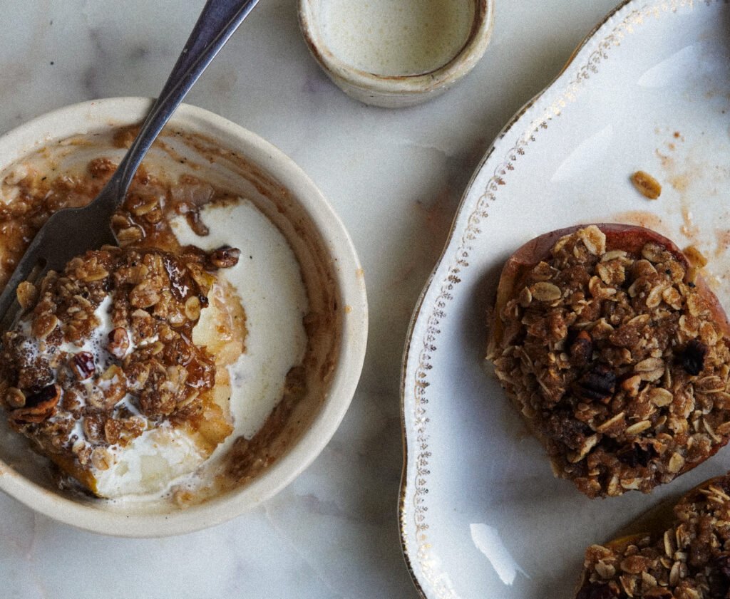 I’m an apple crisp whisperer, I swear. It’s my favorite dessert because it has all of these textural components, it’s simultaneously sweet and tart, it can be eaten warm, room temp, or warm. It’s a versatile dessert and it can fit into other dessert molds as well be it full blown pie or cheater style. I call these cheaters apple crisp because you’re essentially cutting an apple in half, removing the core and molding crisp mixture on top. It’s a quicker way to getting what you want, now.